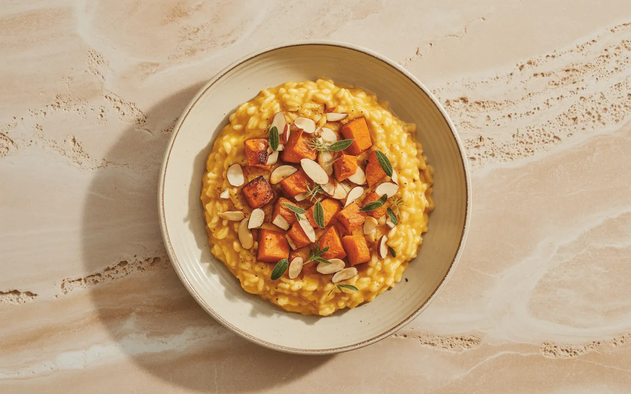 Kremowe risotto dyniowe z migdałami, gremolatą szałwiowo-cytrynową i tartym serem to eleganckie połączenie smaków z delikatną nutą świeżości.