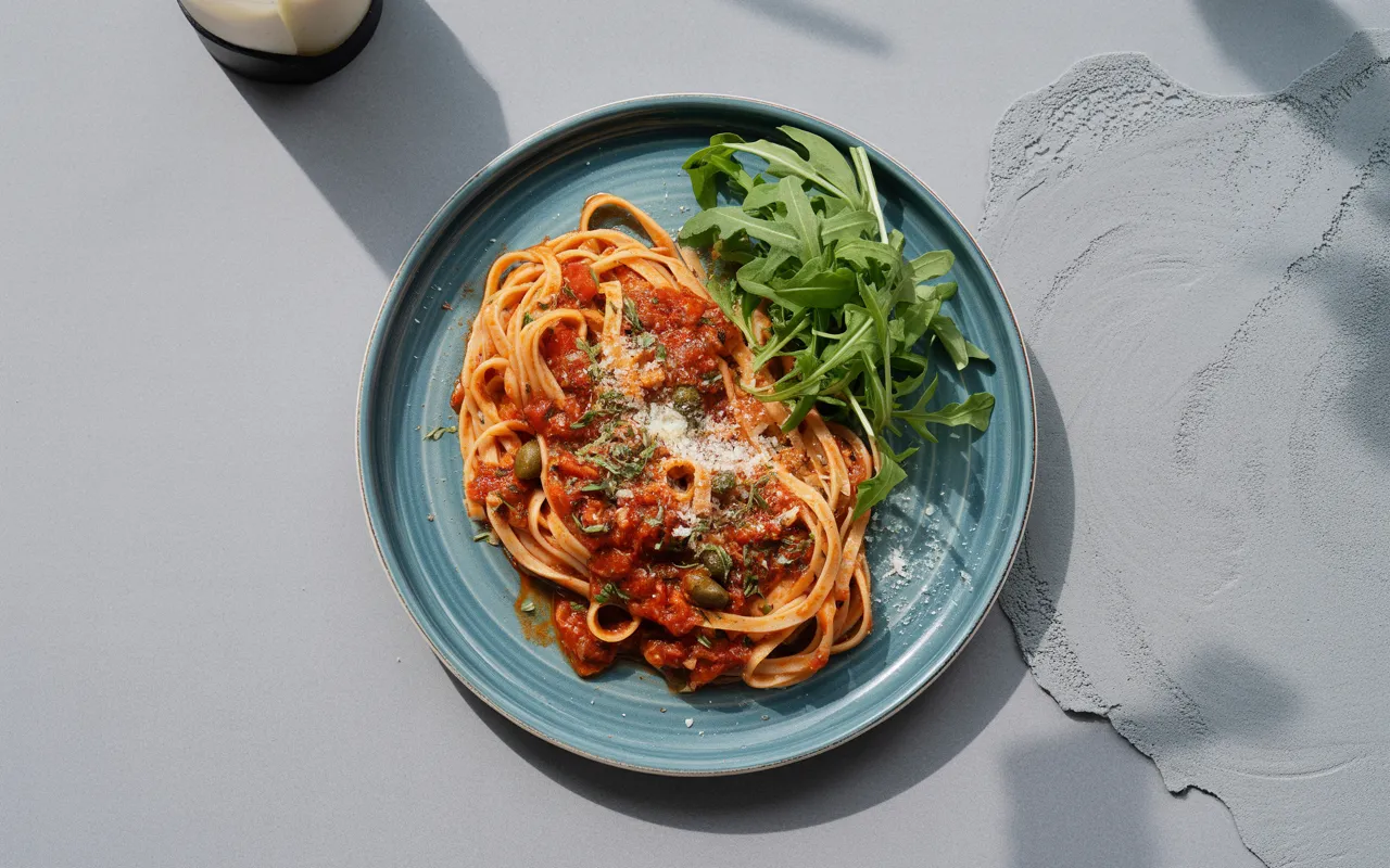To danie to szybki i prosty makaron w aromatycznym sosie pomidorowym z czosnkiem, kaparami i chili. Wszystko gotowane w jednym garnku dla łatwego przygotowania i minimalnej ilości naczyń do mycia.