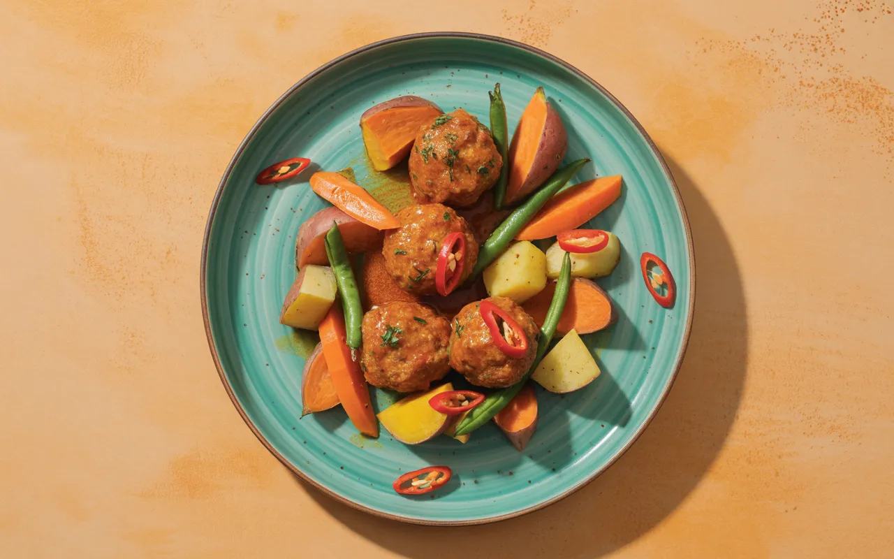 Rozgrzewające danie inspirowane kuchnią tajską. Soczyste pulpeciki z wołowiny pieczone razem z ziemniakami, batatami, marchewką, cebulą i fasolką szparagową. Całość otulona aromatycznym sosem na bazie czerwonej pasty curry, mleczka kokosowego i tamaryndowca, z nutą imbiru, kardamonu i świeżej papryczki chili.